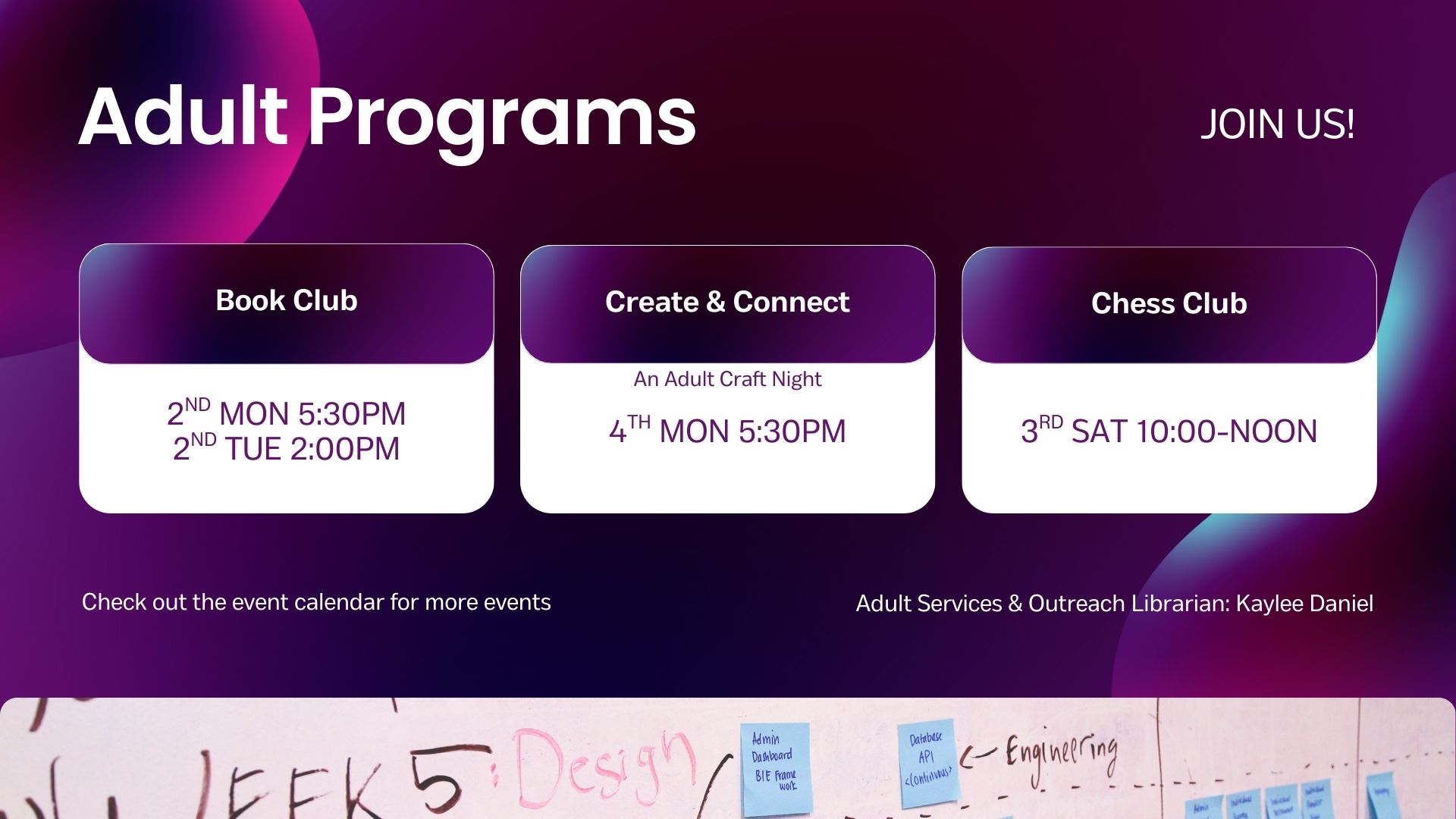 Whether you are looking for the next best seller or researching local history, we can help! We offer many services to our community, including:
